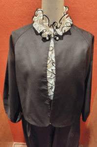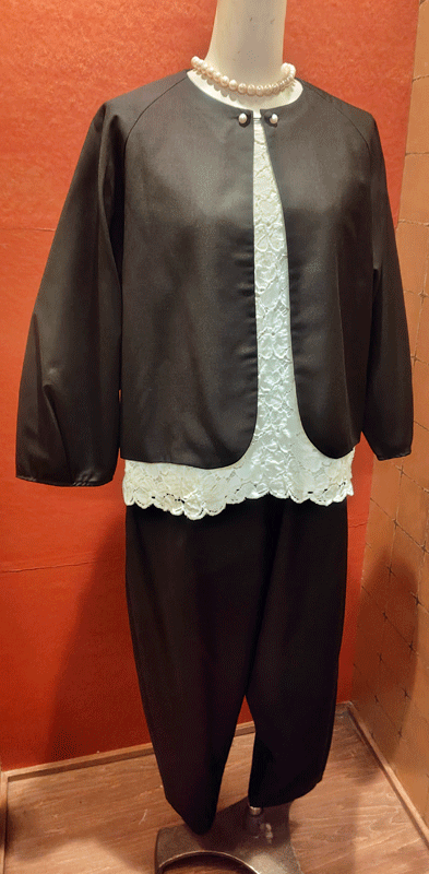 ①パールボタン・ブラックくるみボタン取り換え可能 15,180円 ※水洗い不可 ジャケット本体ポリエステル65%・レーヨン35% 裏地ポリエステル100% パンツ本体ポリエステル65%・レーヨン35%